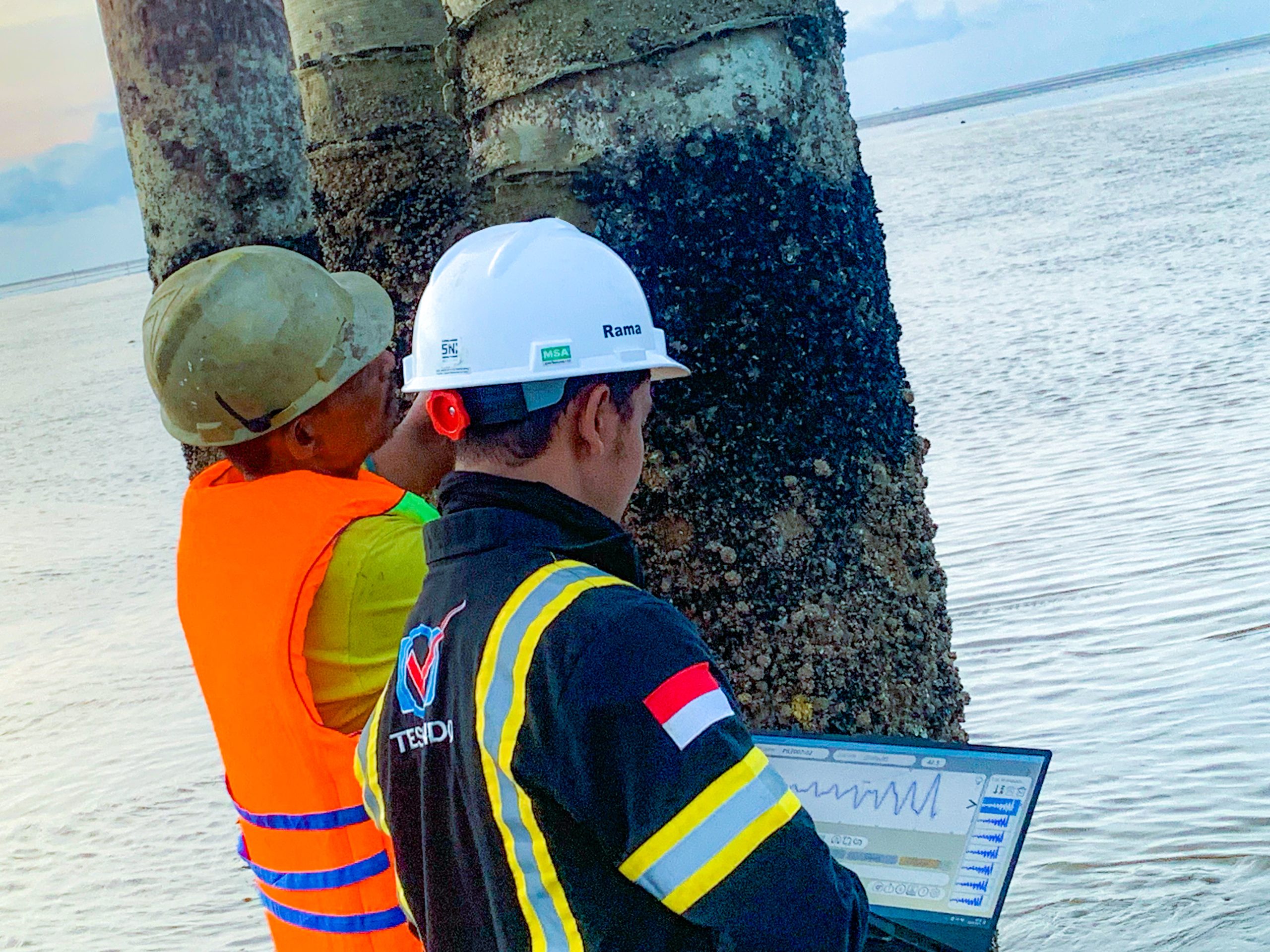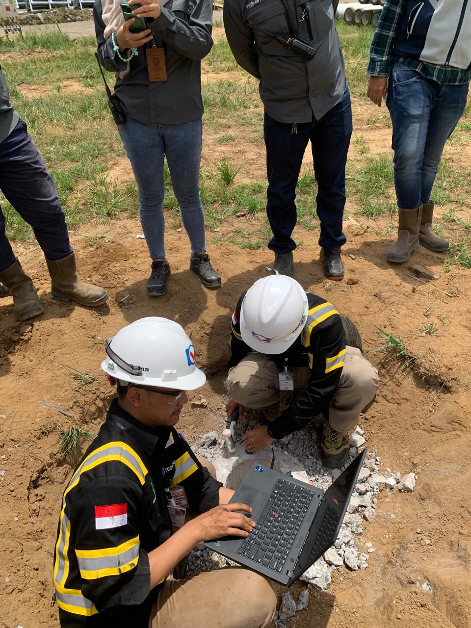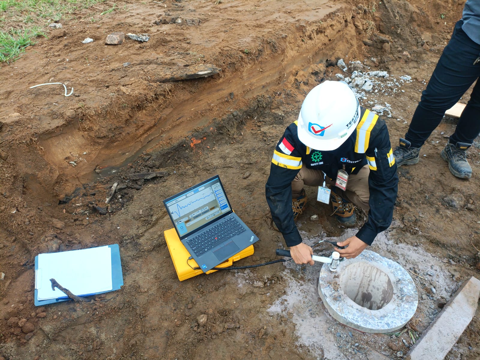 Metode PIT dilakukan dengan memukul kepala tiang menggunakan palu kecil untuk menghasilkan gelombang tegangan, yang kemudian direkam melalui sensor percepatan dan dianalisis pada perangkat lunak khusus. Gambar berikut memperlihatkan proses pengujian langsung di lokasi project baik di darat maupun struktur tiang di area perairan dengan hasil gelombang pantulan ditampilkan secara real-time pada laptop. Tujuannya adalah untuk mendeteksi keretakan, perubahan penampang, dan panjang aktual tiang pancang secara non-destruktif.